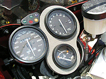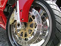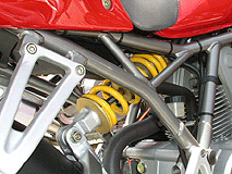 左、オーリンズリアサスペンション。真ん中三連メーター、右マルケジーニ5本キャストホイールにブレンボキャリパー。最初からよだれものの装備が奢られているのが、SS900なのです。