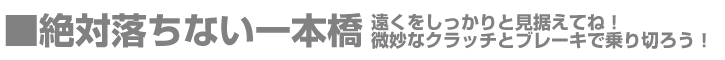 一本橋の幅は30cmもある。この幅を最大限に使ってジグザグに進めば時間と距離を稼ぐことが出来るのだ!極論だけど・・・具体的には橋に乗った瞬間からハンドルを小刻みに、且つリズミカルに左右に切り続ける。切り幅はせいぜい前後に1〜2センチ位。それ以上やると落っこちるからね。これで、結構時間は稼ぐことが出来るぞ!中には逆に安定する人もいる位だから試してみてね。